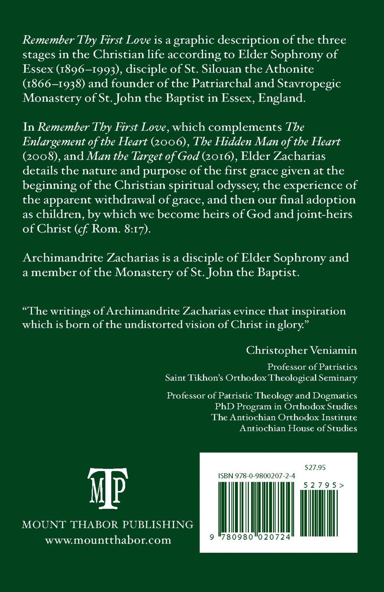Remember Thy First Love is a detailed and graphic description of the three stages in the Christian life according to St. Sophrony the Athonite (1896-1993), disciple of St. Silouan the Athonite (1866-1938) and founder of the Patriarchal and Stavropegic Monastery of St. John the Baptist in Essex, England. In Remember Thy First Love, which complements The Enlargement of the Heart (2006) and The Hidden Man of the Heart (2008), Elder Zacharias discusses the nature and purpose of the first grace given at the beginning of the Christian spiritual odyssey, then the experience of the apparent withdrawal of grace (second stage), and finally our final adoption as children, by which we become heirs of God and joint-heirs of Christ (cf. Rom. 8:17). Fr Zacharias' Remember Thy First Love also includes an invaluable Index of Names and Subjects.